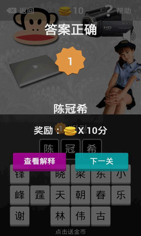 2.每一题目都由一则或多则与明星相关的小提示组成,例如明星的绯闻、出席活动的服装、代表作品等,玩家通过线索来猜测答案。游戏内容覆盖海内外各大娱乐圈,无论是好莱坞电影星辉、亚洲流行音乐俊杰,还是国内影视歌三栖明星,应有尽有。