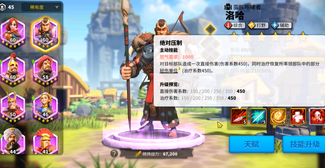 洛哈的治疗机制是持续作战的关键。觉醒技能桀骜之血能在脱离战斗后治疗2000系数轻伤单位,配合打野天赋命运吟诵击败野蛮人时额外获得500系数治疗。通过交替攻击高低级野蛮人营地,可实现越打兵越多的效果。建议保持部队在野外连续作战,回城会重置体力消耗减免效果。装备选择优先考虑狂风套装提升行军速度和野怪伤害,次选通用攻击防御装。