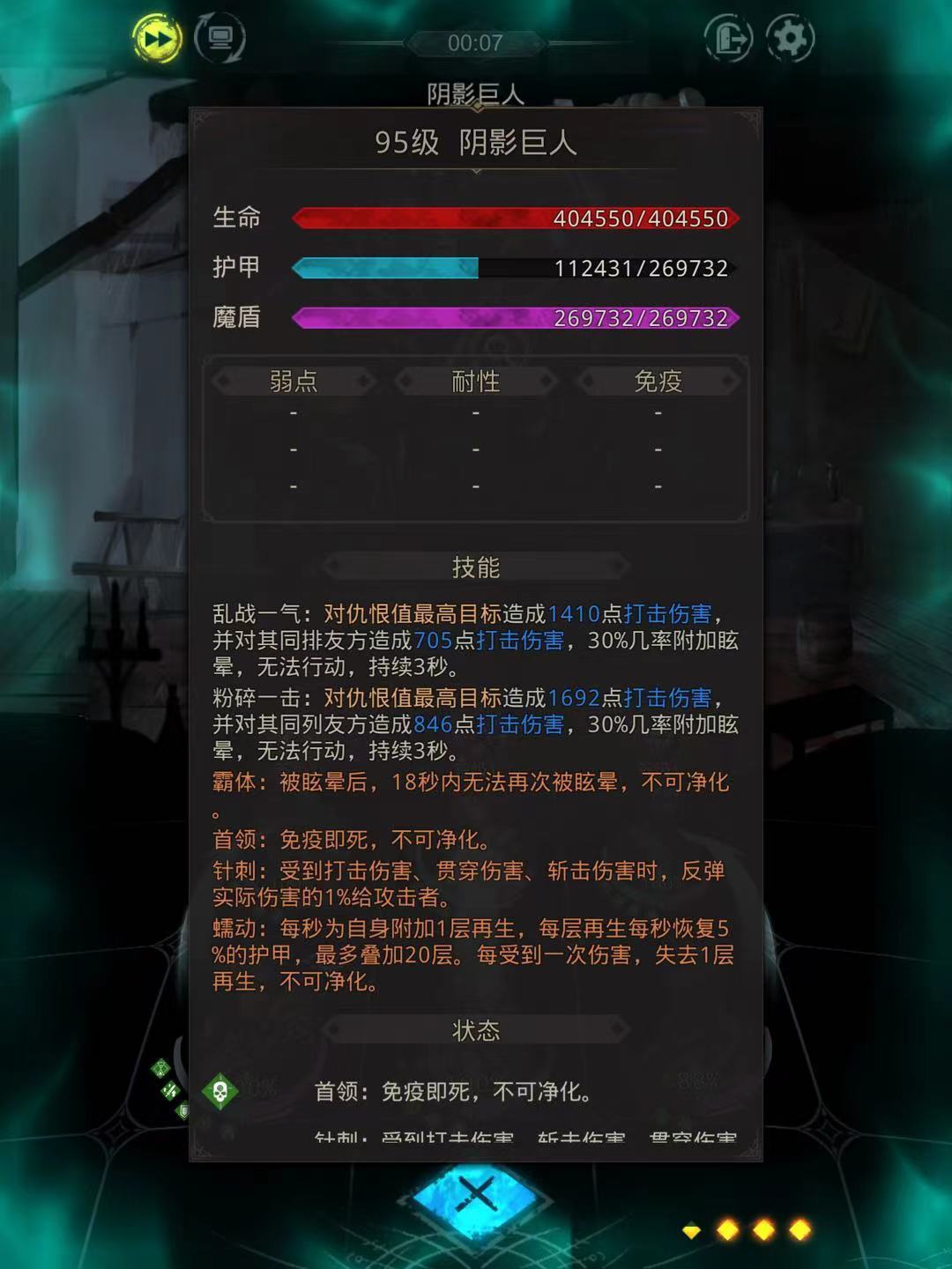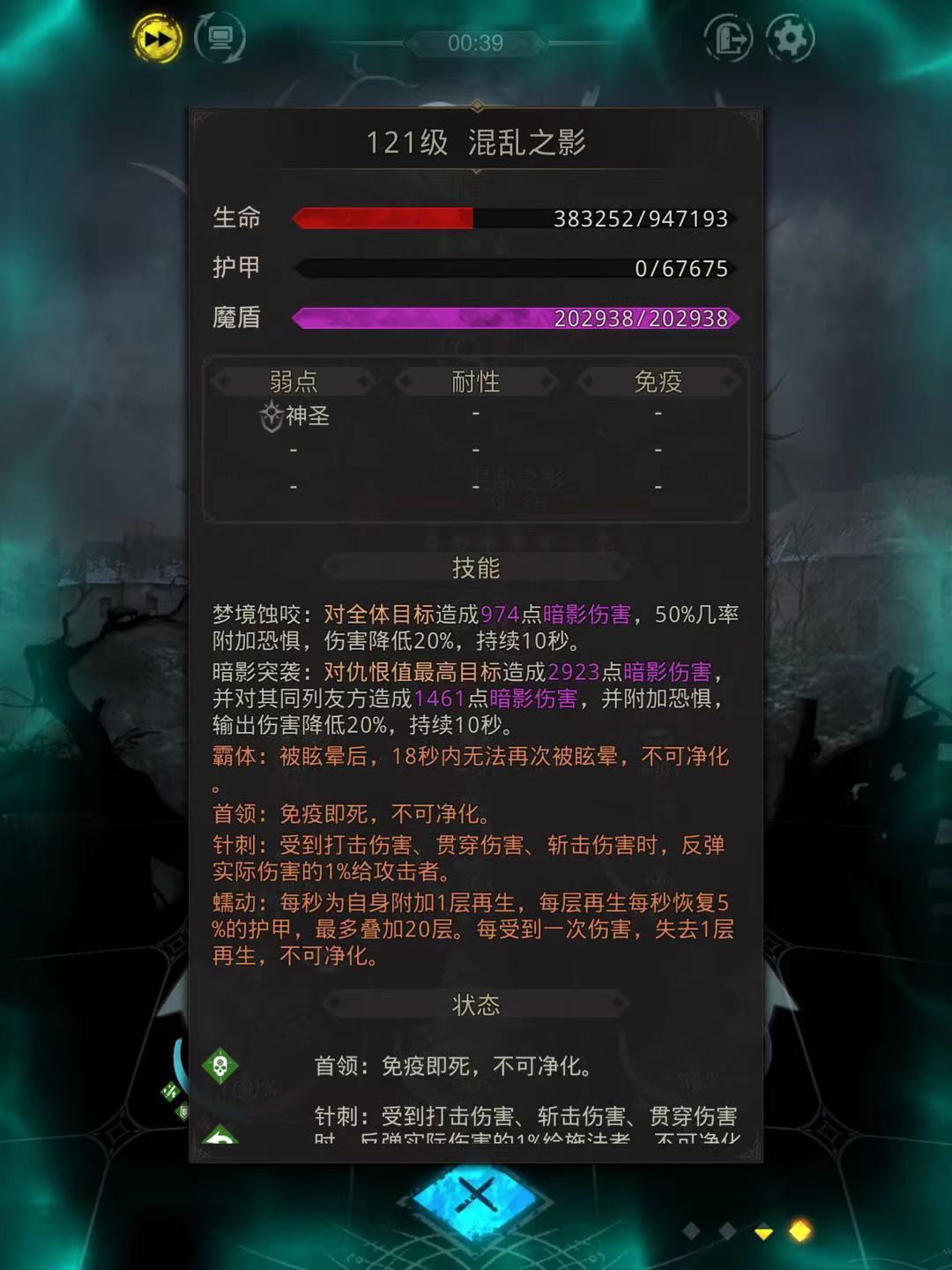 最终BOSS阴影之魇才是真正的挑战,这家伙生命值过百万,护甲和魔盾都很高,还会放恐惧debuff。建议咱们把队伍等级拉到120级以上再来挑战,特别是主输出最好140级。打这个BOSS必须带能穿甲的角色,同时准备暗影抗性药水。推荐阵容是永望、晨星、烛魔、守林、千面这样的组合,注意保持高频输出打断它的再生光环,双奶妈配置会更稳。