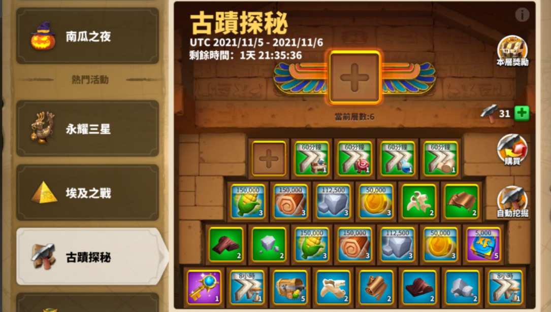 再来,参与古迹探秘活动时,锤子的使用也有技巧。活动里可以选择自动挖掘或者手动挖掘,自动挖掘虽然省事,但可能会浪费锤子。建议先手动挖掘几层,摸清楚规律后再开自动模式。每一层的奖励是固定的,所以尽量把锤子用在更高层数的挖掘上,这样收益更大。如果运气好,还能挖到金宝箱或者其他稀有奖励。
