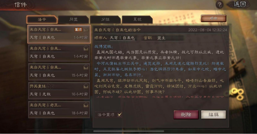 同盟法令是管理成员、协调行动的核心工具。只有盟主、副盟主及官员具备发布权限,通过游戏内法令功能即可操作。发布前需明确目标,例如攻城调度、土地分配或战备动员,确保内容简洁且逻辑清晰。法令发布后,全体成员将收到邮件通知及红点提示,强制阅读的设计保障了信息触达率。