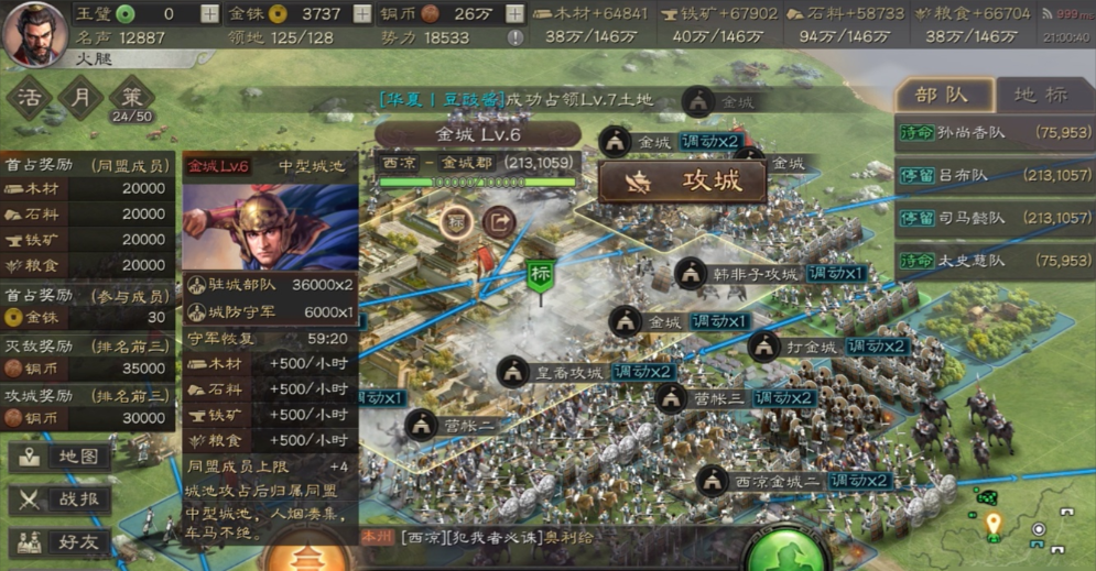 进攻玩家城池是游戏中的重要玩法,成功攻占后能获得金铢、铜币、资源奖励以及成就奖励。首次占领城池时,系统会额外发放金铢,后续攻城则主要提供资源和铜币。参与攻城的盟友也能分到资源,所以多帮盟友打城对整体发展很有帮助。被攻占的城池会成为己方或同盟的领地,提供资源加成和驻军功能,方便后续扩张或防御。