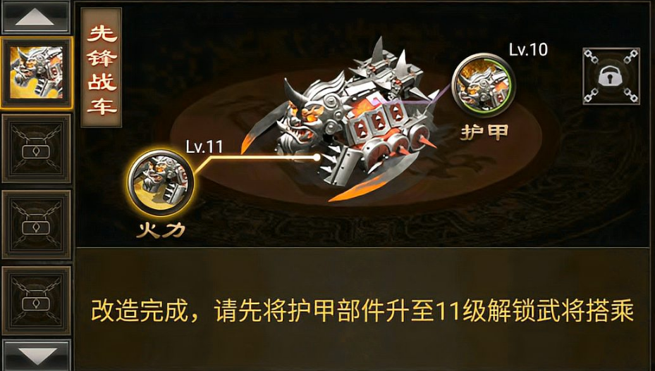 战车的后续强化主要通过改造系统实现,当战车达到三车满级状态后,可以开启改造功能。改造分为三种方式:消耗5铁逐步改造、立即完成改造以及特殊活动改造。改造后的战车属性会得到全面提升,包括攻击力、防御力和特殊效果。战车挂饰的突破也是强化途径之一,每次突破都能提升挂饰的攻击和兵力属性,最高可突破三次。这些强化手段需要玩家合理规划资源投入,以达到最佳的战斗效果。