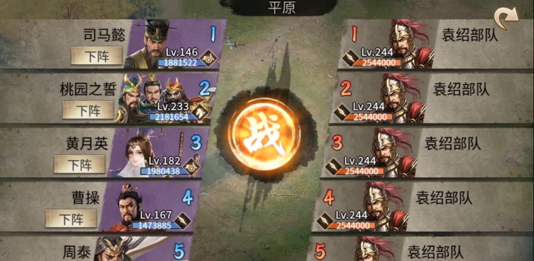 244级副本的核心难点在于首次挑战时的无敌状态,其攻防血属性极高,常规攻击几乎无法造成有效伤害。首次尝试后系统会触发剧情,通过点袁绍部队旁的方天画戟使属性大幅下降,需至少3名武将(含2名联合武将)集中输出,优先使用破甲战车削弱防御,并保留曹操的控制技能用于最终阶段。马超的骑兵需在后期出场,利用高机动性清理残血单位。
