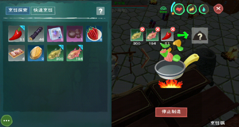 制作川椒鲤鱼需要借助游戏中的烹饪锅,这个工具在玩家新手阶段就可以解锁。将准备好的红鲤鱼、绿鲤鱼和辣椒全部放入锅中,然后点击烹饪按钮,稍等片刻就能成功制作出这道菜。整个过程非常简单直接,玩家只需要准备好材料,剩下的步骤交给系统自动完成即可。这道料理的食物价值达到90点,相当于普通菜肴的1.5倍,非常适合在长途探险或者资源收集前进行储备。辣椒带来的辛辣属性还能够提高角色的耐热性,在火山区域活动时尤其有用。