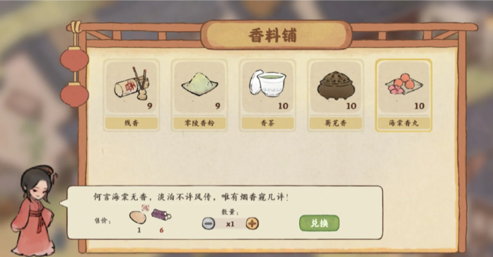 知道了在哪儿做,接下来最关键的就是搞清楚配方了。做四和香丸需要的材料比较固定,根据可靠的资料,它的配方是任意一朵绣球花加上任意品质的龙脑香。这里要注意两个关键点,第一是绣球花,你家园的花圃里可以种出各种花,其中就包括了绣球,你得确保自己有种出来并且收好了。第二是龙脑香,这是一种香料,它可不能通过种植获得。香料的获取途径相对来说比较单一,主要就是通过购买。游戏里有两个地方可以买到香料,一个是在游乐的杂货铺里,你可以使用游戏货币玥琅来购买丙级或者丁级的香料。另一个地方是山遇商店,在那里你可以用青田玉坠购买到乙级的香料。在你打算做四和香丸之前,最好先去这两个商店转转,看看有没有龙脑香卖,提前囤一点货。