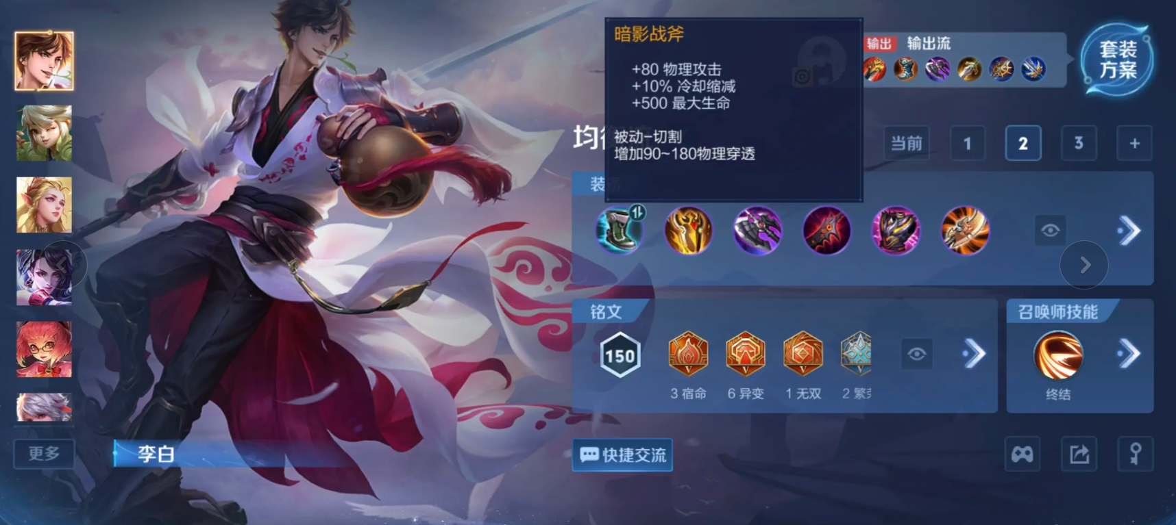 推荐装备包括暗影战斧、影忍之足、泣血之刃、反伤刺甲、不祥征兆和破军。这些装备组合能提供物理攻击、冷却缩减、生命值和防御属性,让李白在面对高爆发敌人时更从容。出装顺序建议先出暗影战斧以增强穿透和技能频率,接着选择影忍之足来减少物理伤害,泣血之刃则提供吸血续航,反伤刺甲增加反伤效果,不祥征兆降低敌人攻速,最后补破军来强化收割残血的能力。
