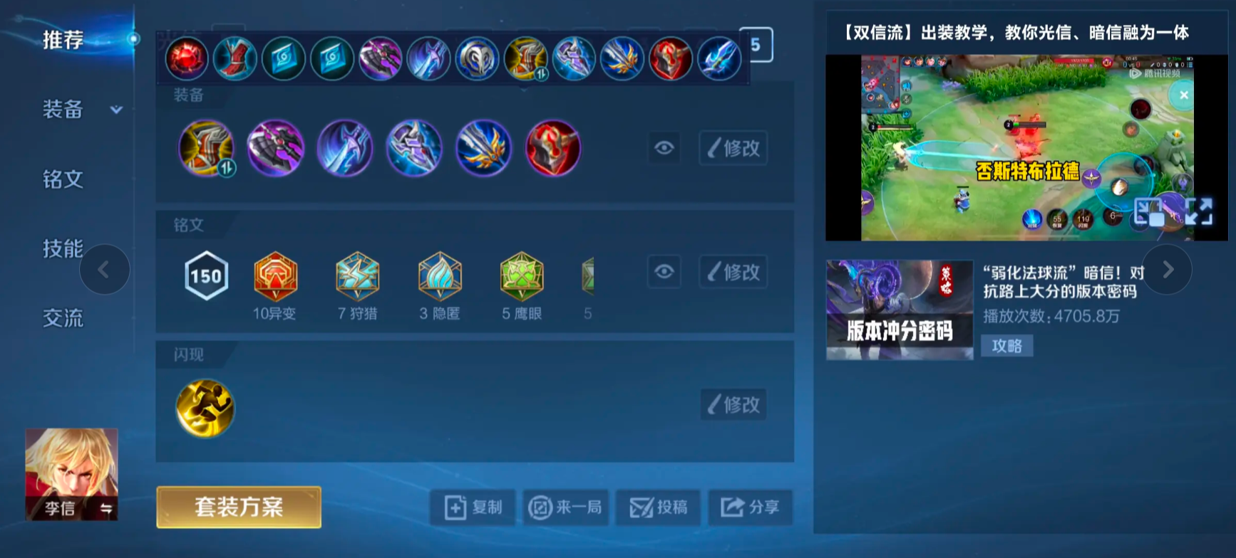 铭文搭配方面,光信通常使用百穿铭文来强化物理穿透和攻击力。推荐组合是9个异变、1个祸源、10个鹰眼和10个隐匿,这套铭文能提供高额攻击和穿透,确保光信在前期对线中占据优势。1个祸源铭文是为了触发幸运暴击,虽然几率不高但有时能带来意外惊喜。隐匿铭文增加攻击力和移速,让光信更灵活地追击或撤退。如果对手控制较多,可以将部分隐匿替换为狩猎来稍微提升攻速。
