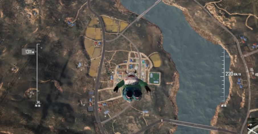 如果目标点就在航线正下方或者非常近,那你只需要在飞机经过目标点正上方时跳下,然后瞬间将视角垂直向下,让人物进入头朝下的垂直俯冲状态,这样就能以最快速度(约234公里每小时)直插地面,成为第一批落地的人。如果你的目标点离航线有个七八百米,可以采用水平+垂直斜飞的方法:先让人物平飞,以126公里每小时的最大水平速度快速接近目标上空,等剩余距离缩短到四五百米内时,再立刻转为垂直俯冲,这样既能保证水平移动距离,又不损失太多垂直下落的速度。