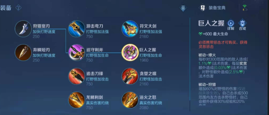 如果你打法比较激进,喜欢带线牵制并且骚扰敌方野区,那可以试试边路惩戒流出装。这套出装的核心是携带惩击天赋技能出门,先出巨人之握(巡守利斧升级而来)。 这件打野装备可以让程咬金在清完自家或敌方野怪时获得额外经验和经济,还能叠加生命值。鞋子依然是抵抗之靴。然后可以出暗影战斧来提升伤害和冷却缩减,让自己在单挑或带线时更有威胁。 接着补上极寒风暴和不死鸟之眼,这两件装备依然是核心,保证了冷却缩减、防御和回血能力。 最后一件装备比较灵活,可以选择名刀·司命来关键时刻保命,也可以选择贤者的庇护(复活甲)或者血魔之怒,根据战场情况来调整。这套出装的思路就是用惩击快速发育和反野,打乱对方节奏,利用程咬金的机动性和恢复能力进行单带牵制。