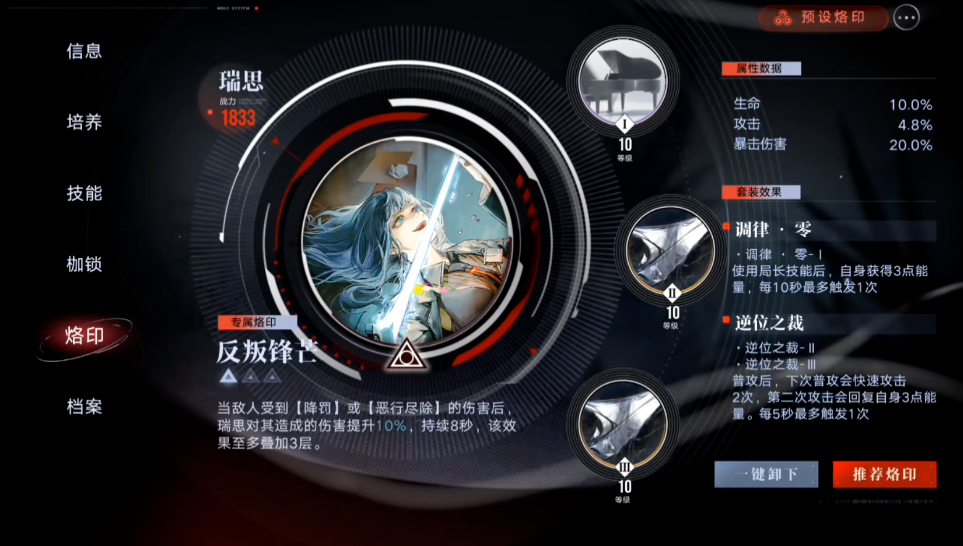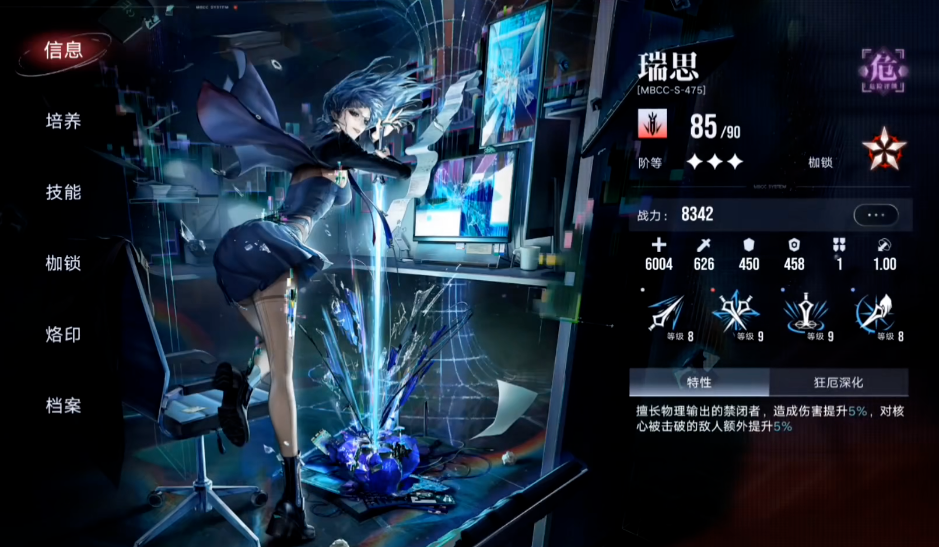 战局中,光剑的投放位置尤为关键,因为它决定了后续拾取或引爆的覆盖范围,玩家可以手动选择精准落点以覆盖更多敌人或针对关键目标。她的专属烙印反叛锋芒提供了重要的增伤机制,当敌人受到降罚或恶行尽除伤害后,瑞思对其造成的伤害会获得可叠加的提升效果,这进一步放大了她的持续输出能力。在角色养成上,瑞思的初始特性与狂厄深化都表明她是一名擅长物理输出的禁闭者,且对核心已被击破的敌人能造成额外伤害,这明确了她在队伍中作为物理爆发核心的定位。技能升级应优先保证关键输出技能的等级,烙印搭配则倾向于选择能强化其伤害或机动性的套装。