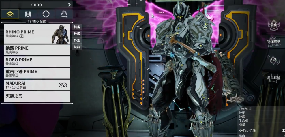 在度过最初的新手期后,可以优先获取狂野犀牛战甲作为开荒路上的坚实后盾。犀牛并非初始战甲,但其获取门槛很低,部件蓝图可通过击败金星或木星的BOSS掉落,也可通过登录奖励获得。犀牛的核心优势在于无与伦比的生存能力与容错率,其钢化皮肤技能可提供强大的伤害吸收护盾,期间免疫所有伤害与异常状态,能让新手在面对高压战斗时站稳脚跟。战吼技能还能为自身及队友提升伤害输出,在组队时非常受欢迎。制作犀牛的材料需求平缓,成型快速,是替代初始战甲、平稳度过开荒期的优秀选择。