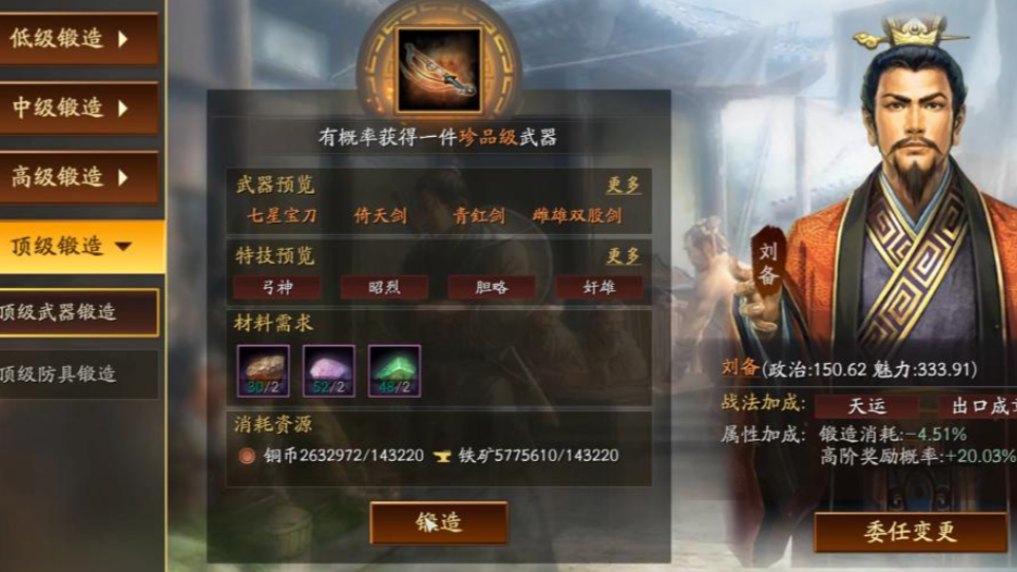 除了寻访使,小乔同样非常适合担任驯马官与锻造官。委任为驯马官时,她能大幅提升高品质马匹的产出概率,同时小幅降低驯马的时间与资源消耗;委任为锻造官时,则能大幅提升锻造出珍品、上品品质武器与防具的概率。尽管小乔的政治属性并不突出,导致其节省资源的效果有限,但其核心价值依然在于通过高魅力带来的提升高阶奖励概率这一核心收益,这使得她在锻造和驯马领域依然是顶级的委任人选之一。