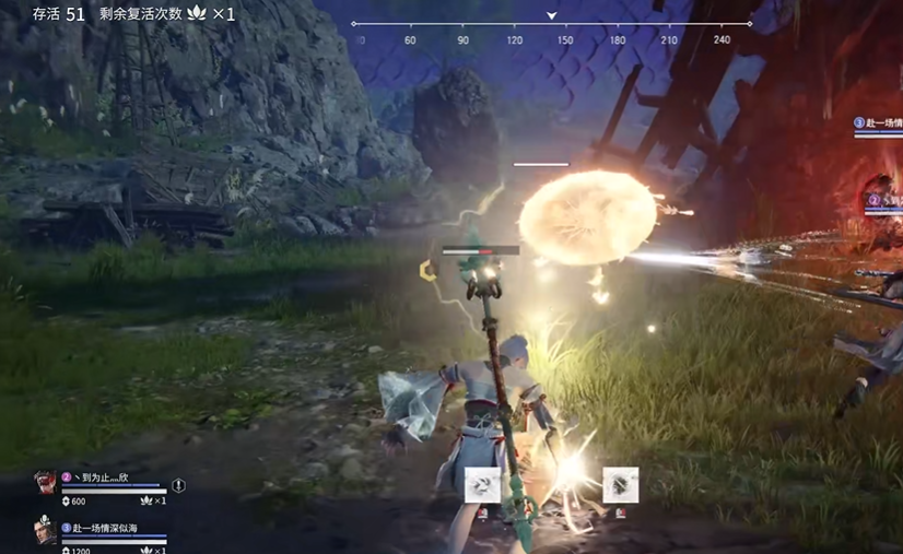 如果你所在的队伍成功在拥有烛龙之魂预告的对局中击败所有对手拿到第一名,并且三名队员都活着进入胜利时刻,系统便会开启挑战烛龙之魂的环节,此时你们会被传送到上空进入一个简单的PVE场景,你不能移动只能进行振刀操作,烛龙之魂会向你发射紫色的光球。