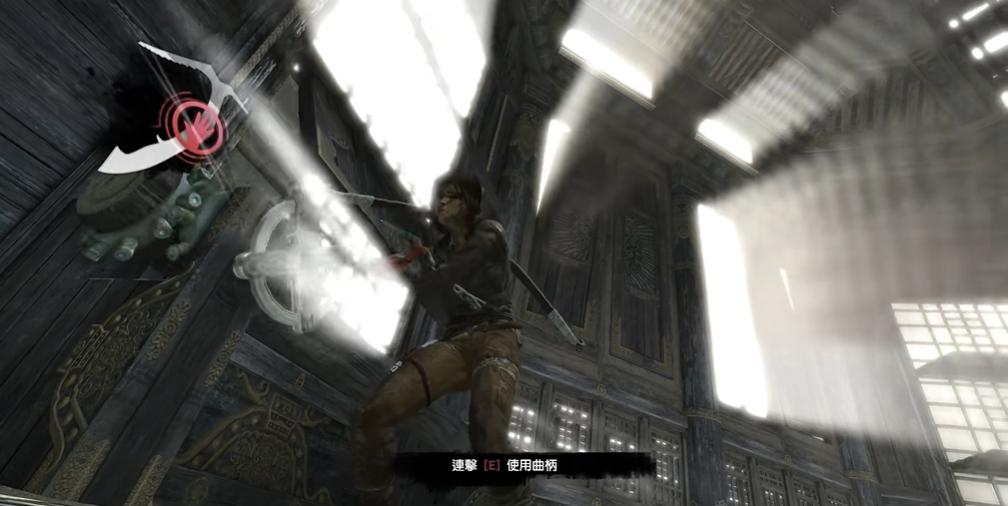 随后大风会把上面那扇窗户也吹开,风力会吹着平台移动,抓住时机跳到墙上并沿着横梁爬过去即可。紧接着是第二个部分,场景中央悬挂着一个大钟,左右两边有吹风的窗户。首先打开一侧的窗户,根据风向用弓箭射出绳索箭拉住大钟,逆着风的方向拉一下,让大钟被风吹回去时摆动幅度增大,撞断一侧的木柱子。用同样的方法,打开另一侧窗户并拉大钟撞断另一边的柱子。最后将左右两扇窗户全部打开,再次拉动大钟去撞击中间的横梁,大钟便会落下砸穿地面,露出进入下方山洞的通道。