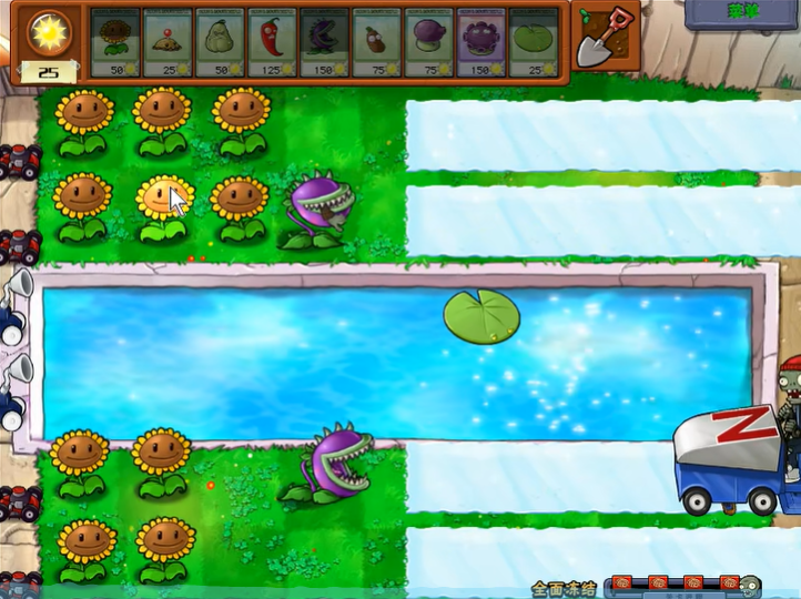 开局之后,你要立刻在场地后方种植至少两排向日葵来快速积累阳光。当最早的一两个僵尸出现时,不要犹豫,直接用窝瓜或土豆地雷解决它们,保护你的向日葵不受干扰。阳光充足后,就要开始着手布置你的核心防线,在水路可以先放置水草来暂时应对僵尸。