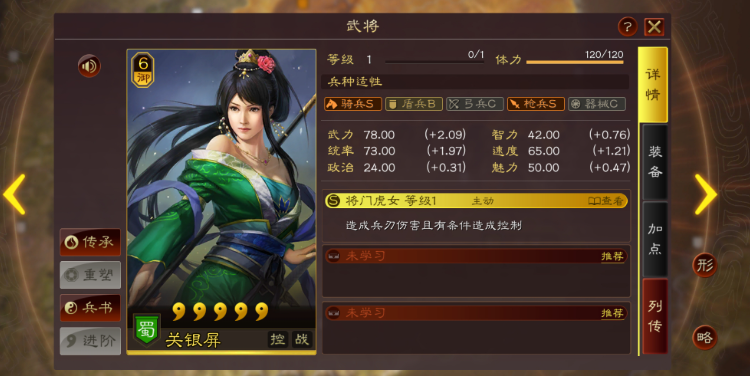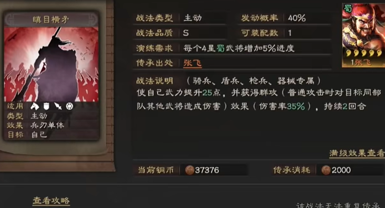 张姬作为蜀国4统御武将,枪兵适性达S级,自带战法“奋矛英姿”是搭配核心:每次普攻降低敌方统率并转化为自身武力,第4次普攻触发高额群体伤害。输出向战法搭配需紧扣“高频普攻”机制,强攻+瞋目横矛是经典组合,强攻提供连击效果加速被动叠加,瞋目横矛进一步提升普攻伤害与武力加成,适合快速破局的对战场景;追求爆发可选择裸衣血战+速乘其利,前者提供前三回合连击与伤害加成,后者补充控制链,配合被动的群体伤害能在前中期压低敌方血线。辅助向搭配则利用其高速度成长,盛气凌敌压制敌方普攻,当锋摧决破除指挥战法,奇计良谋可先手减伤保护队友,适配缺少控制或防御的阵容。