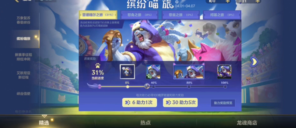 缤纷喵旅活动是一个限时福利玩法,咱们可以通过参与助力来获取皮肤、魄罗能量等奖励。活动分为四个独立栏目,分别是雷喵喵尔之旅、怒角之旅、菲兹之旅和柯基之旅,每个栏目的进度和奖励互不干扰,大家可以根据自己喜欢的主题选择参与。每次助力需要消耗积分,积分可以通过购买战旗道具获得,60点券能换6积分,助力时还能必得100魄罗能量和随机奖励,进度达到5%、40%、80%、100%时还能解锁对应档位的皮肤或道具哦。