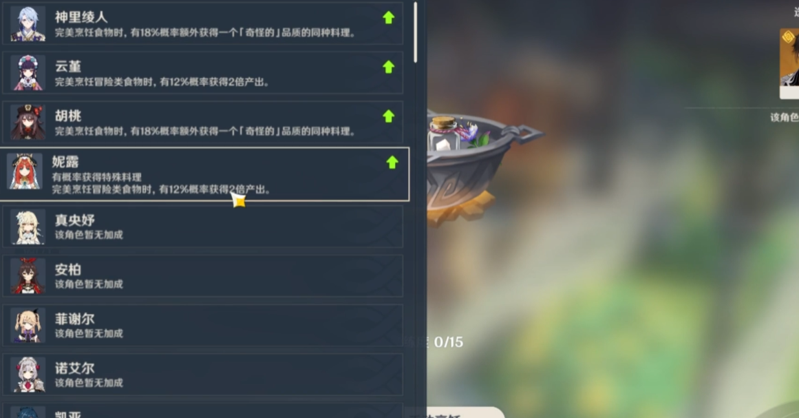 妮露的特殊料理名为婆娑一舞,是通过制作帕蒂沙兰布丁时概率获得的专属料理。该料理需要由妮露本人进行烹饪才有机会生成,基础配方为帕蒂沙兰2份、须弥蔷薇1份、牛奶1份和糖1份。当使用这些材料制作帕蒂沙兰布丁时,有一定几率转化为妮露的特色料理婆娑一舞。