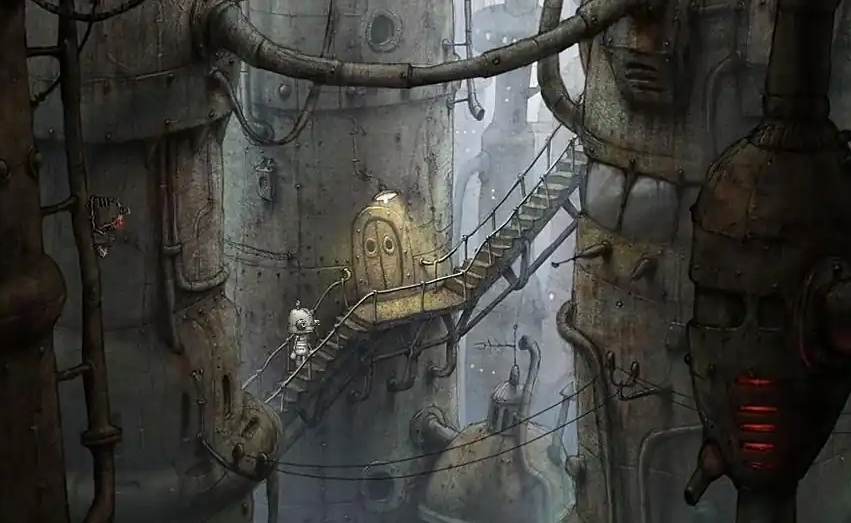 机械迷城第八关的核心任务是帮助三位乐手修复乐器并解决相关谜题。这一关的场景位于一个钟表内部,玩家需要通过操作机关、收集道具和与NPC互动来推进流程。首先需要找到五颗五子棋棋子,分别位于门口、吧台左侧、机器人手下、椅子下方和右侧门上方。收集完成后,将棋子交给萨克斯风乐手,触发演奏事件并引来楼上机器人大妈的花盆攻击。
