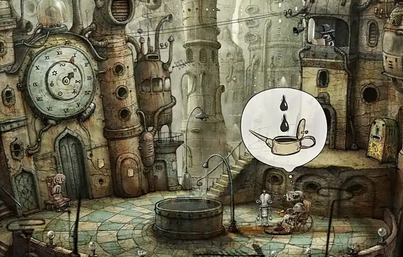 在油店右侧取得胶带后,用其粘取污水处的苍蝇,再将苍蝇放入油店老板的油桶中偷取油桶。将油桶交给鼓手后,他会开始击鼓,再次引发楼上大妈的花盆攻击。需前往广场区域,将油壶装满葵花油交给轮椅机器人,推动剧情发展。广场左侧的机器人大妈正在解题,门上有两个标签,暂时无需理会。