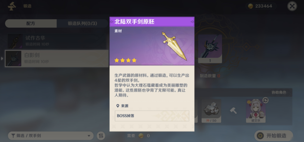 拿到剑胚后,接下来就是准备锻造材料了。除了剑胚,还需要50个水晶块和50个白铁矿,这些材料平时挖矿时记得多攒点。带着材料去找蒙德的瓦格纳或者璃月的老章,选择委托锻造就能看到可制作的武器列表。找到北路双手剑的选项,点击开始锻造,稍等片刻就能拿到成品啦!