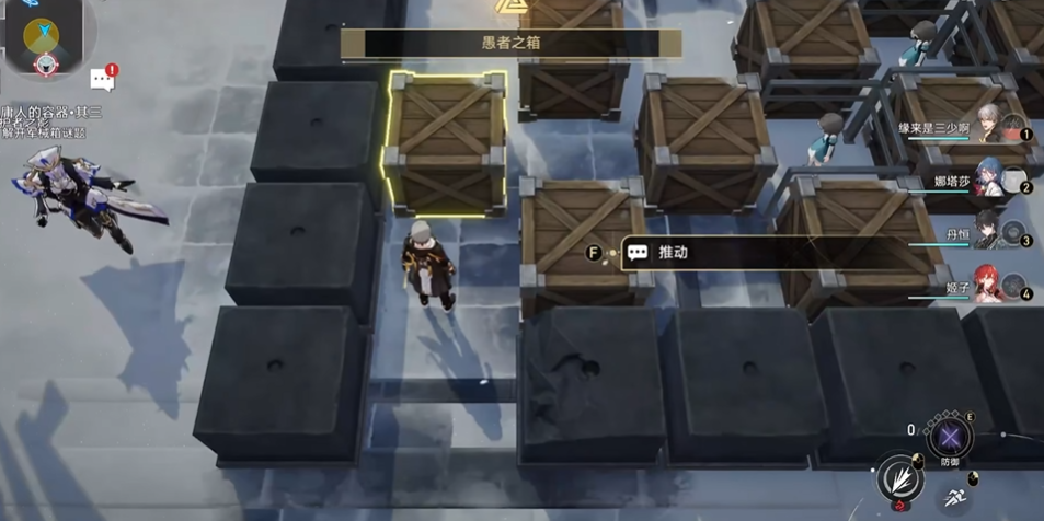 要完成庸人的容器·其三任务,需要先到永冬岭找守护者之影接任务,然后通过推箱子解谜救出小女孩,最后击败希莉儿并和曼娅对话即可。咱们得传送到永冬岭的锚点,和守护者之影对话触发任务。这个任务的核心是推箱子解谜,一共需要移动六个箱子,按照特定顺序推动才能救出被困的小女孩。第一步是把最左边的箱子往上推一格,接着把最下面的箱子往左推一格,再把最右边的箱子往下推一格。这时候箱子排列会变得松散一些,方便后续操作。