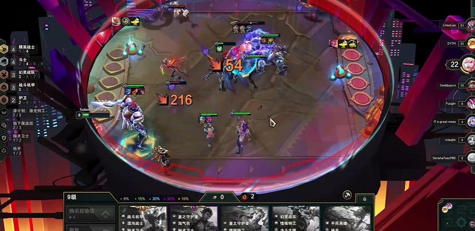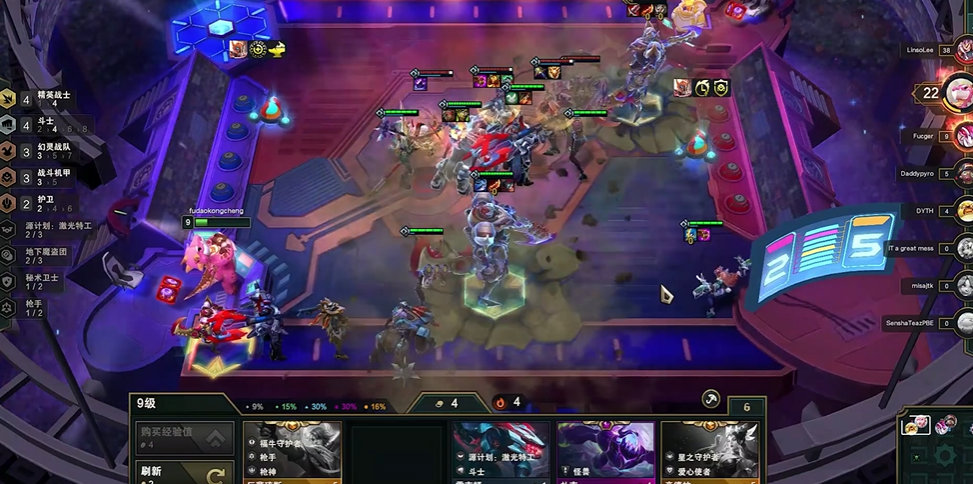 后期5-1拉8级后继续搜卡,优先将索拉卡和猪妹升到两星。如果有斗士或爱心转职,可以下掉瑟提换成6斗士4爱心羁绊,否则单挂两星瑟提补充2护卫。8人口阶段需要追三星锐雯和贾克斯,这两张卡到三后可以考虑拉9级补蕾欧娜,凑出3战斗机甲和2秘术卫士。站位方面斗士全部顶在第一排,索拉卡放在后排角落,盲僧在旁边保护防止刺客切入。