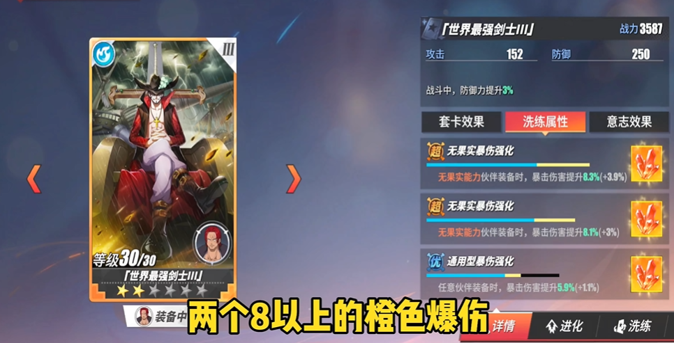 通用战意卡适合前期过渡,比如绿色卡可以临时提升生命或防御,蓝色卡则对应力、技、心三系属性。不过到了中后期,这些低品质卡片会被逐渐淘汰,所以别投入太多资源去升级。洗练药水比较珍贵,前期不用强求完美属性,能用就行,等后期资源充足再慢慢优化。如果抽到了专属战意卡,比如艾尼路、鳄鱼这些传奇伙伴的专属卡,直接给对应角色装上,专属卡的加成效果比通用卡更契合角色特性。