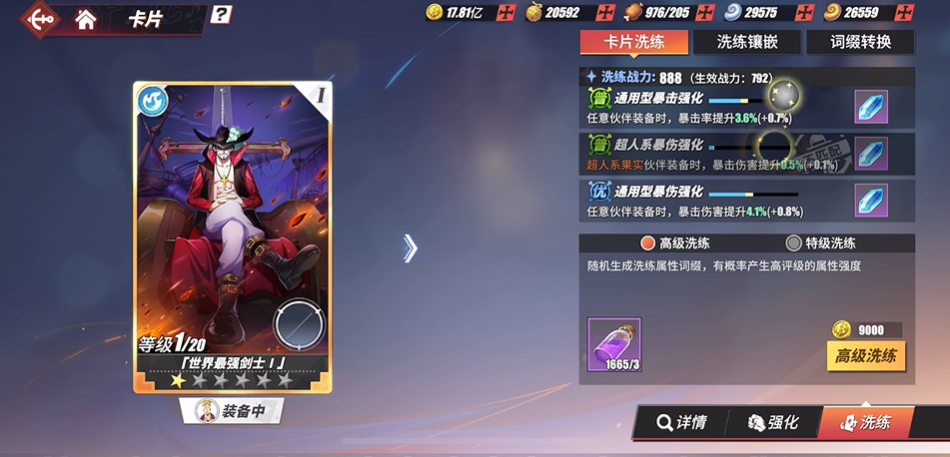 紫卡是平民玩家的首选,性价比高且容易获取,建议心、技、力各培养两套,优先选择暴击率加成的套装。金卡虽然属性更强,但获取难度大,凑齐套装需要一定运气,如果暂时没有成套的金卡,可以先给主力伙伴搭配两张金卡过渡。洗练时优先选择暴击率和暴击增伤属性,攻击固定值的提升效果有限,生命和防御属性在实战中作用不大,所以洗练资源尽量留给暴击相关词条。