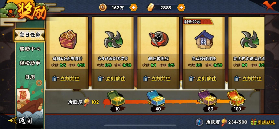 每日任务是行动点数最稳定的来源之一。完成决斗场、秘境挑战或小队突袭等玩法后,系统会根据表现发放对应点数奖励。活跃度系统同样关键,当每日活跃度达到100时,开启的宝箱会提供随机奖励,包含行动点数或忍者碎片等资源。周常任务如追击晓组织或忍法帖玩法也会在结算时赠送点数,需按时参与避免遗漏。