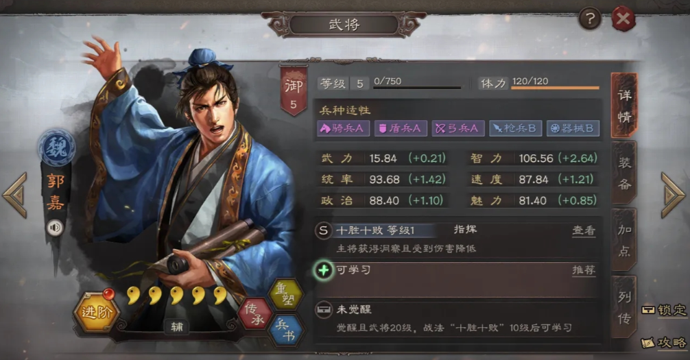 自带高谋略加成的指挥战法和主动战法要优先学习,比如能延长负面状态或造成高额谋略伤害的战法。注意战法之间的联动效果,比如先施加减益状态再触发依赖负面状态的谋略攻击。三个战法栏位填满后,通过战法点分配提升关键战法的等级,优先升级核心输出或控制类战法。觉醒后解锁的第三个战法栏位可以补充辅助型谋略战法,形成完整战术链。
