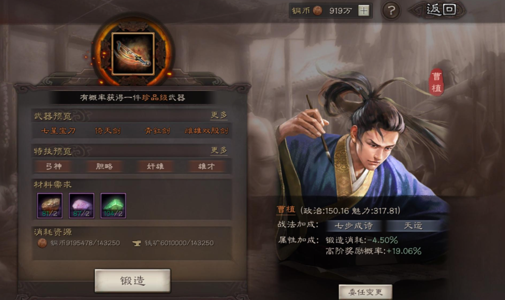武器和宝物中带有智力加成的装备要优先配备给谋略型武将,特别是带有特技的装备往往能提供额外效果。坐骑虽然主要提升速度,但部分特殊坐骑也能增加谋略相关属性。通过锻造和寻访获取高品质装备时,注意筛选智力加成高的部件,逐步替换低级装备。装备强化不要盲目追求高等级,合理分配资源确保主力谋略武将优先成型。