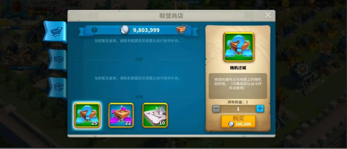 迁城是玩家调整战略位置的重要操作。定点迁城道具可通过游戏商城购买,消耗1500钻石即可获得。该道具允许玩家将城市精确迁移至指定坐标,尤其适合需要靠近联盟领地或资源富集区域的情况。购买路径为点击主界面商店图标,进入购物车页面后选择其他分类,下拉至底部即可找到定点迁城道具。