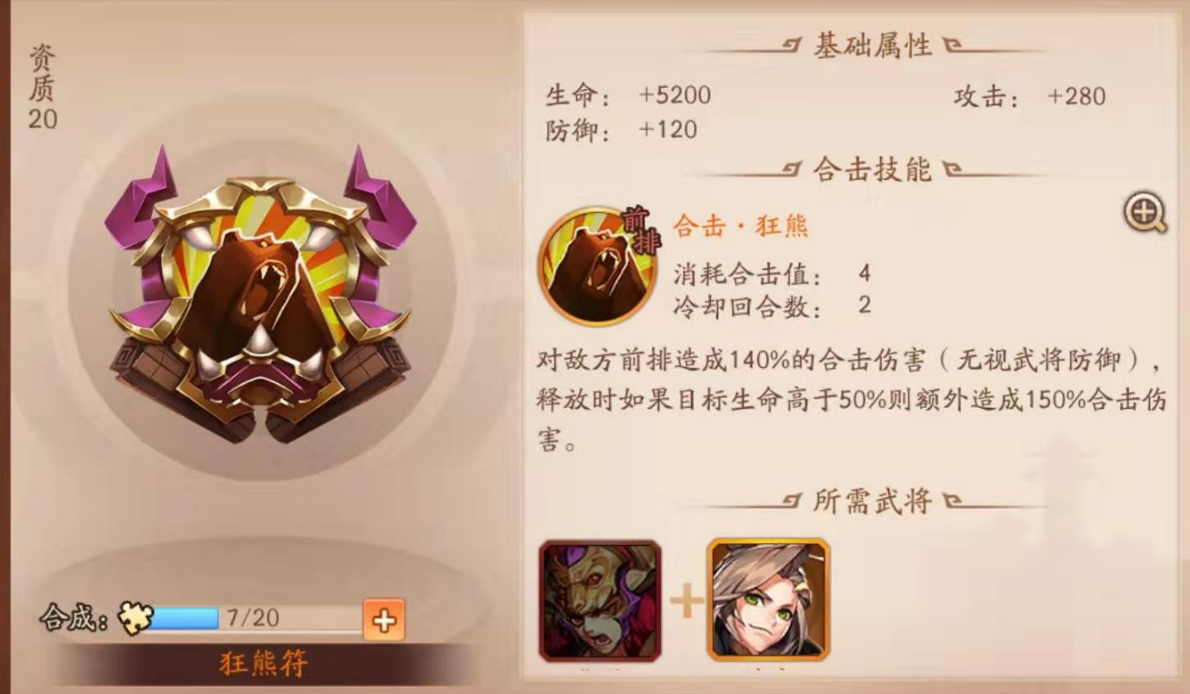 狂熊符因其对前排双倍伤害的特性成为特殊战术选择,基础162%加额外170%的伤害倍率能快速消耗敌方前排血量,尤其克制魏、蜀等靠前排爆发的阵容。虽然该符仅为橙色品质,但在特定战局中效果显著。金乌战法配合华雄可实现伤害叠加,通过回合结算引爆高额输出,而盘古斧的控场能力能有效保护吕布等高伤武将。需注意合击符的养成需优先升星核心技能,资源倾斜至对整体战力提升最大的兵符。