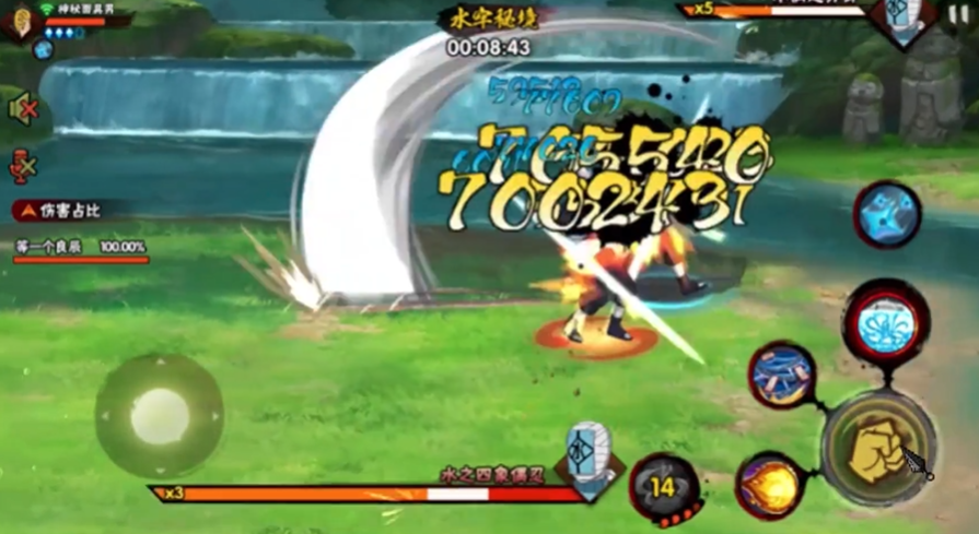 进入战斗后,优先清理普通敌人以减少干扰。对于BOSS战,需避免将其击入两侧水面,否则会触发水龙弹连发。若BOSS被击入水中,可站到场地中央躲避水龙弹。水泡是另一项需要注意的机制,触碰后会被控制并导致BOSS回血,队友可用技能打破水泡解救。战斗中应合理分配忍术,例如用风遁强化火遁效果,或利用水遁与风遁的组合扩大攻击范围。