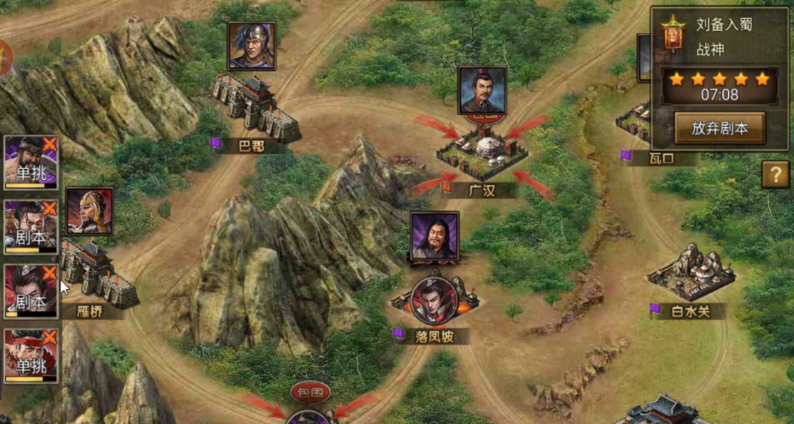 路线选择是通关的关键,通常从广汉或涪城作为起点,逐步推进至雁桥和成都。在涪城或广汉刷够影子后,优先突进到汉中或巴郡,确保后续单挑效率。汉中事件NPC可提供额外时间奖励,需在适当时机触发。雁桥事件完成后会减少成都守军,因此需提前安排武将处理。突进10次可增加1分钟时间,借兵20次同样有额外时间奖励,合理利用这些机制能有效缓解时间压力。
