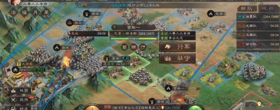 体力无法通过购买或道具直接补充,只能依靠时间自然恢复。不过有些特殊活动会提供双倍体力效果,比如在特定时间段内,占领或攻城等行动的体力消耗翻倍,但收益也会相应增加。这时候可以集中主力武将行动,最大化利用体力加成。