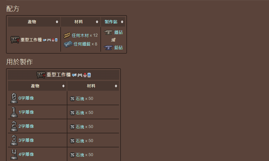 重型工作台是咱们在泰拉瑞亚里超级实用的制作站,专门用来搞各种建筑材料、装饰品和机械。别看它名字带工作台,其实和普通工作台完全不是一回事,也不能算作NPC房子的平坦表面物品。想要做它的话,得准备好12块任意木材和8块任意铁锭,在铁砧或铅砧旁边合成。有了它,咱们就能解锁石板、沙岩板、金属镀层这些高级建材,还能搞出文字雕像和小动物雕像,让家里更有特色。