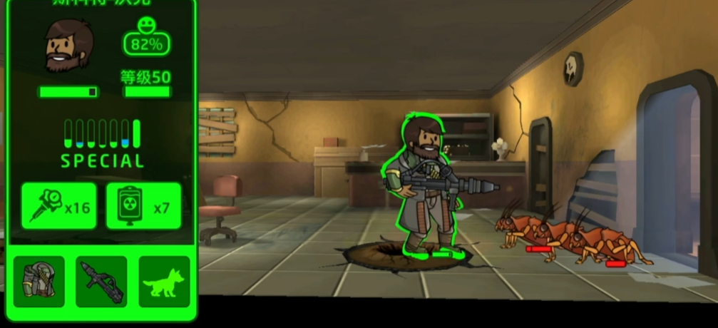 复仇者激光枪这类连射武器特别吃香,打死一个敌人后剩余伤害能溅射到下个目标,配合高敏捷角色和加攻速的宠物,输出效率直接起飞。记得优先给主力输出角色堆敏捷属性,其次注意暴击率(幸运属性)和暴击判定(感知属性),治疗针和消辐宁必须带够,尤其是遇到带辐射伤害的敌人。副本难度和掉落品质由角色等级决定,想拿好东西就派高级角色出战。