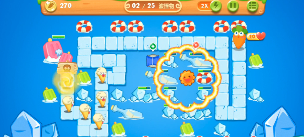 使用冰锥塔消灭150个怪物。开局后立即开始打这些道具,利用冰锥的攻击来快速完成,如果提前规划好路线,可以在怪物出现前就清理一部分。确保冰锥塔持续输出,以达到击杀怪物的数量要求,同时避免浪费金币在无关的炮塔上。观察道具的分布,优先处理靠近路径的绿色冰棍,以节省时间并避免遗漏。
