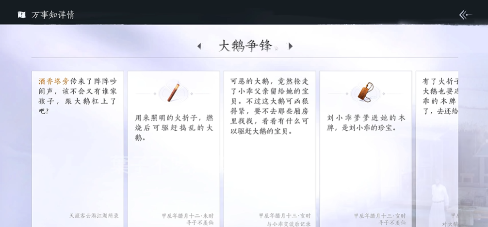 面对大鹅时需快速操作直接点击道具栏中的火折子或通过对话选择使用功能。大鹅被火惊吓后会立即逃窜,同时掉落任务物品小乖的木牌。记得拾取木牌并交还给刘小乖,这是完成任务的关键步骤之一。整个过程无需战斗,但需注意动作连贯性,避免因延迟导致大鹅重新进入攻击状态。任务奖励包含多项实用资源,包括专属头像恰少年、20个长鸣玉以及1500点经验值和通宝。这些奖励对初期角色成长和探索度提升有明显帮助。尤其清河探索度增加10点,能为区域解锁提供助力。若任务过程中火折子丢失,可重新返回厢房获取,系统会刷新道具位置。