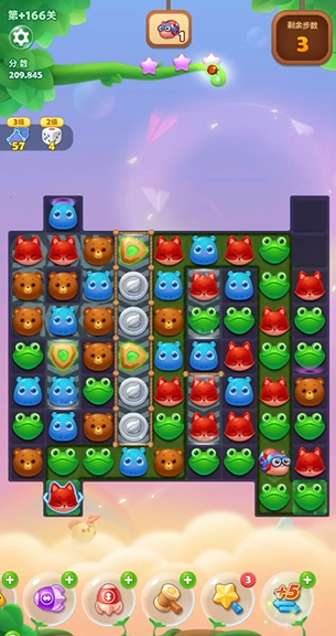 开局第一步是奠定优势的关键,需要将画面中间偏右的河马与紧邻其右侧的红狐狸进行交换,此举可以组合出一只魔力鸟。必须注意交换的对象是右侧狐狸,与左侧交换可能导致局面陷入被动。随后立即使用生成的魔力鸟单独吸收河马,这次消除能够直接送走位于右下角的两只蜗牛,同时在上方区域促使四个蜗牛合并,并自然形成两个竖向的直线特效。紧接着交换这两个竖向特效,可以一次性送走上方的四个蜗牛,并成功打开左上角的通道,使新的动物填充进来,从而极大扩展可操作空间。