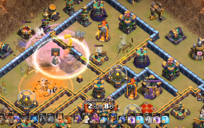 阵型布局与兵种拉扯能放大克制效果,防御时避免防空建筑密集摆放,防止被金龙溅射摧毁,将多头地狱塔、防空火箭分散布置,配合空气炮改变金龙飞行路径,延长其在防御火力内的停留时间,进攻时用小型兵种拉扯金龙仇恨,改变其移动与攻击方向,使其脱离友军保护,再用分散空军集火击杀,拉扯过程中把控下兵时机与位置,避免单位扎堆被溅射,最大化克制手段的实战作用。